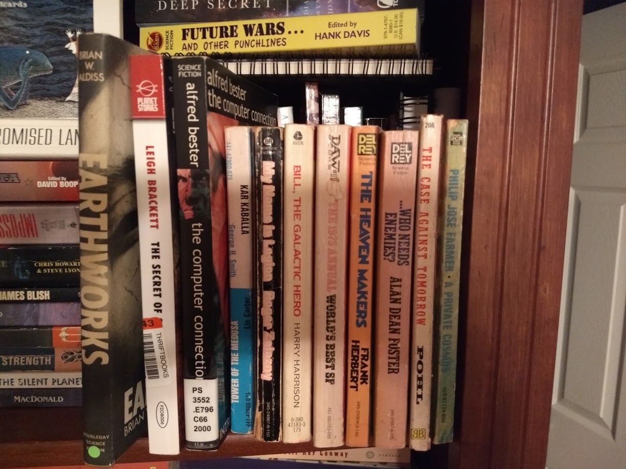 The book donation table makes this easy. I've been picking things out here and there all year. I wish more James Tiptree, Jr. would show up, though -- I only have one story. Here's my current pile, except for the Aldiss books I found the other day and which are in my car which is in the shop.